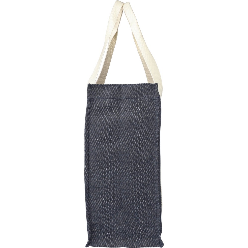 Bevásárlótáska 15 cm-es talpszélességgel és hosszú vászon fogantyúkkal. A farmer anyag 65% poliészterből és 35% pamutból készült. Egy nyomógombbal zárható. A farmer színtartóssága 2-3 szintig terjed. Anyaga: 280 g/m2.