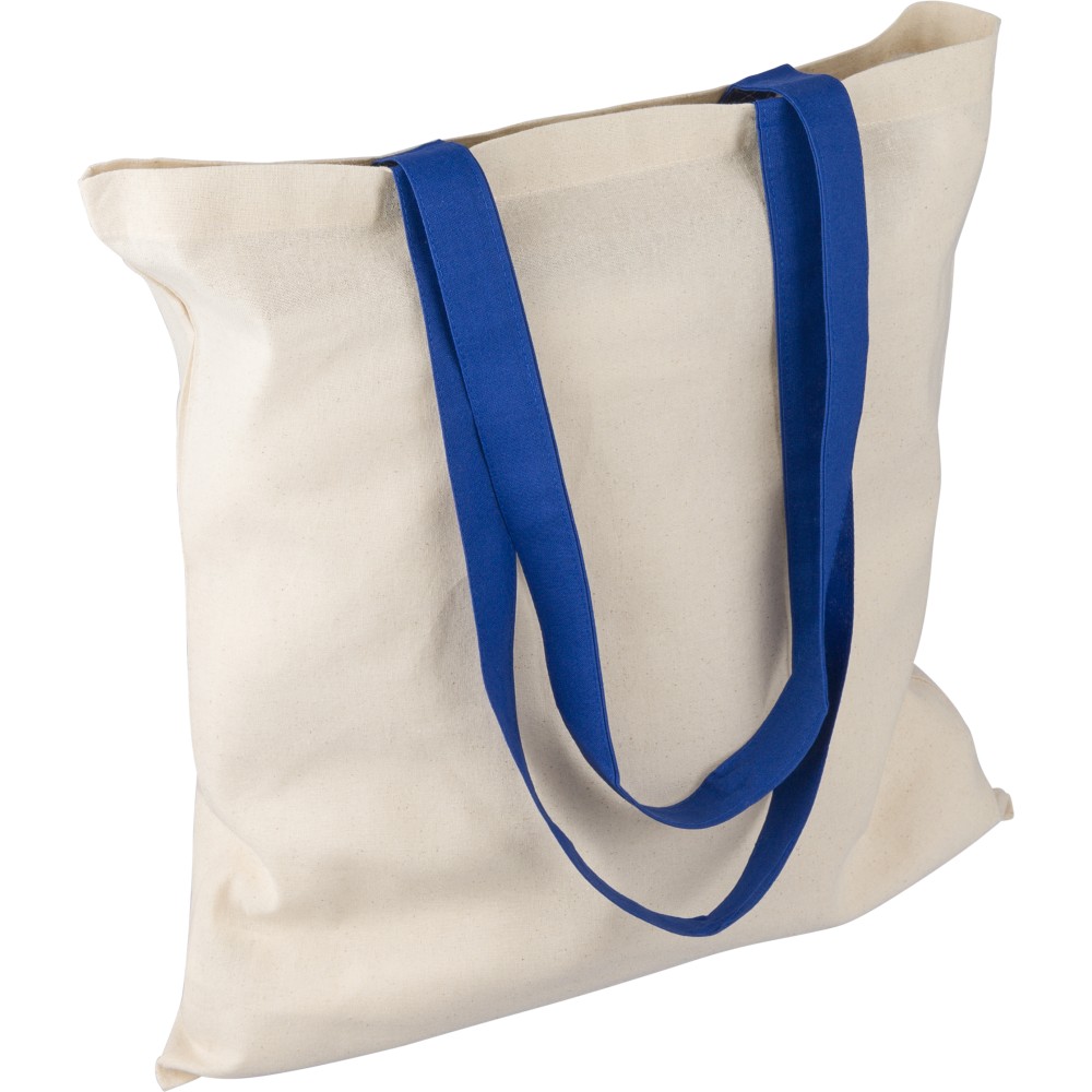 Oeko-Tex minősítésű, 140 g/m2 pamutból készült bevásárlótáska natúr színben, színes fülekkel. Mérete 38 × 42 cm, a fülek hossza 70 cm, szélessége 2,5 cm. Oeko-Tex címkével ellátva.
