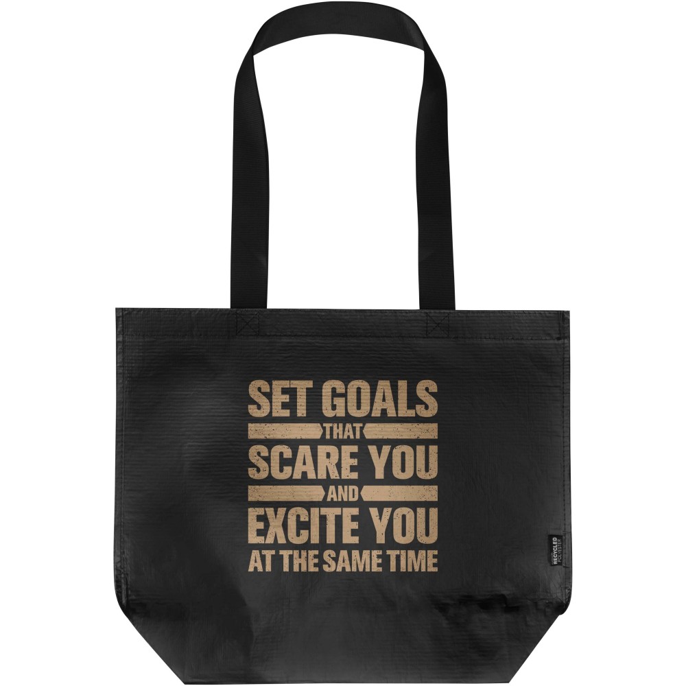 Duplán laminált aljú bevásárlótáska 150 g/m2 súlyú, GRS tanúsítvánnyal rendelkező, újrahasznosított RPET anyagból készül. A dupla laminálásnak köszönhetően a táska fokozott tartóssággal és vízlepergető tulajdonságokkal rendelkezik, így megbízható megoldást nyújt a mindennapi használat során. A termék tágas, nyitott főrekesszel, megerősített hordfülekkel és extra kapacitást biztosító széles alsó résszel rendelkezik. A 18 literes űrtartalmú táska teherbírása 10 kg, így esztétikus és praktikus választás bevásárláshoz, szakvásárokra vagy reprezentatív céges eseményekre. Az újrahasznosított alapanyag révén kiválóan alkalmas öko-szemléletű emblémázott ajándéknak.