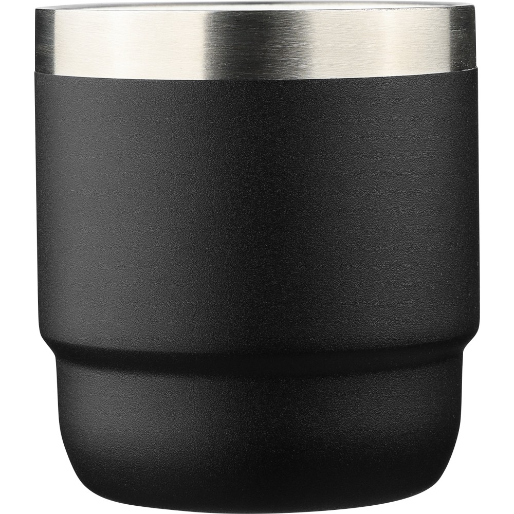 Újrahasznosított rozsdamentes acélból készült bögre (180 ml) duplafalú kialakítással, kerámia belső bevonattal és fogantyúval, a csészén lézergravírozott recycled (újrahasznosított) rozsdamentes acél alapanyagra utaló logó található, darabonként barna kartondobozba csomagolva.
