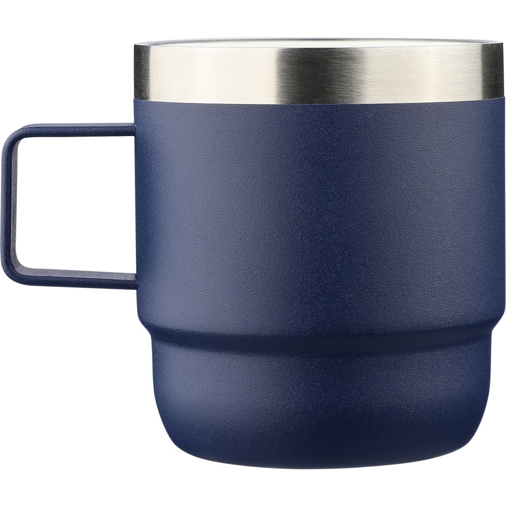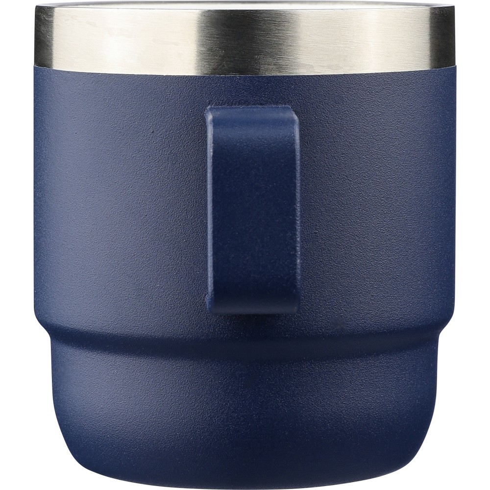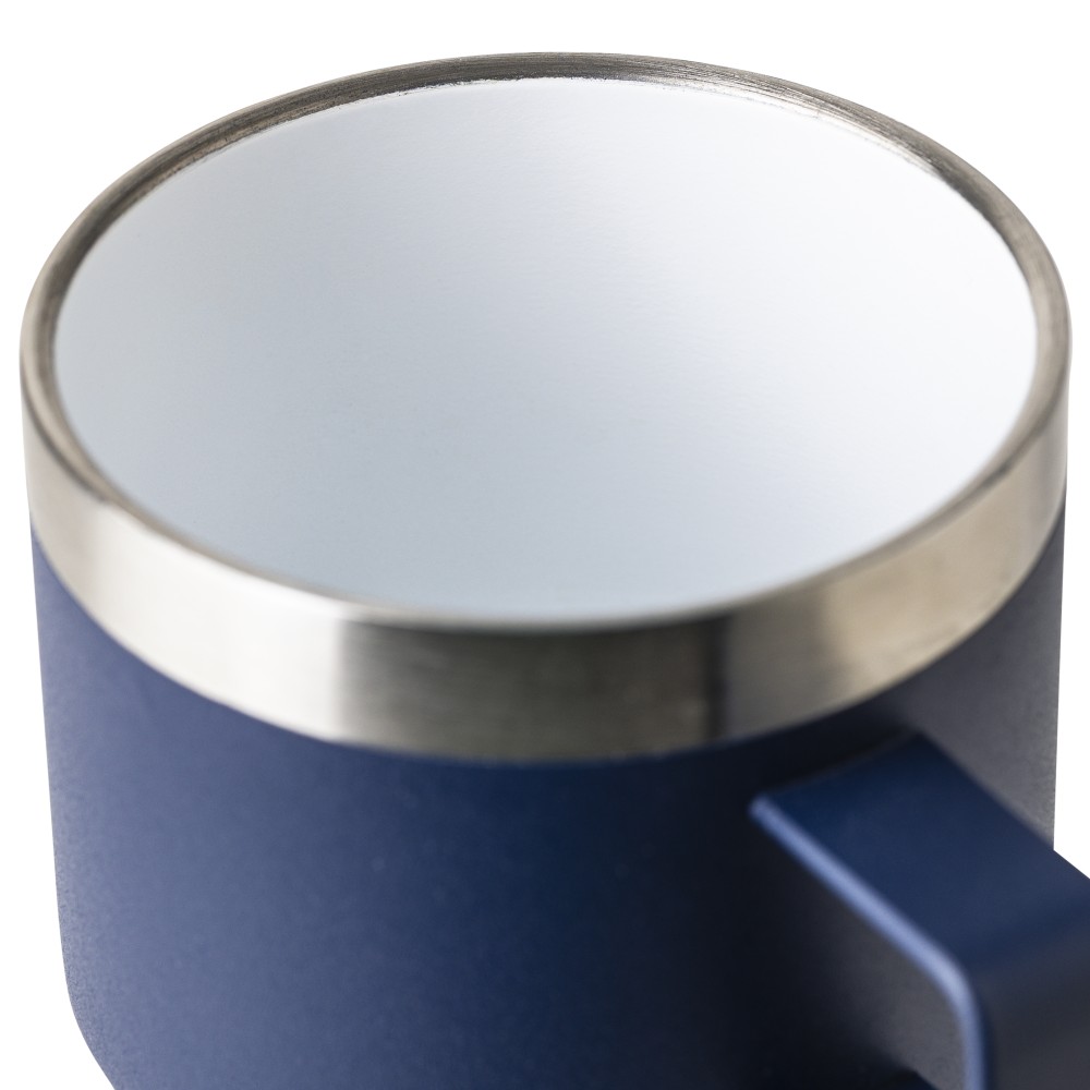 Újrahasznosított rozsdamentes acélból készült bögre (180 ml) duplafalú kialakítással, kerámia belső bevonattal és fogantyúval, a csészén lézergravírozott recycled (újrahasznosított) rozsdamentes acél alapanyagra utaló logó található, darabonként barna kartondobozba csomagolva.
