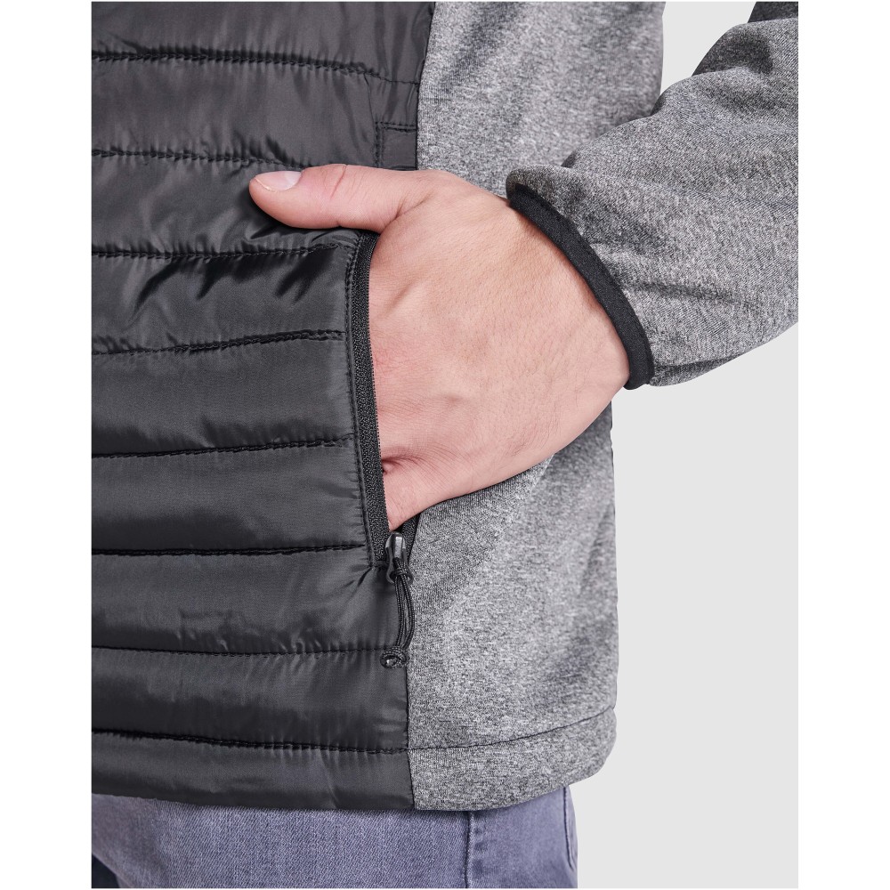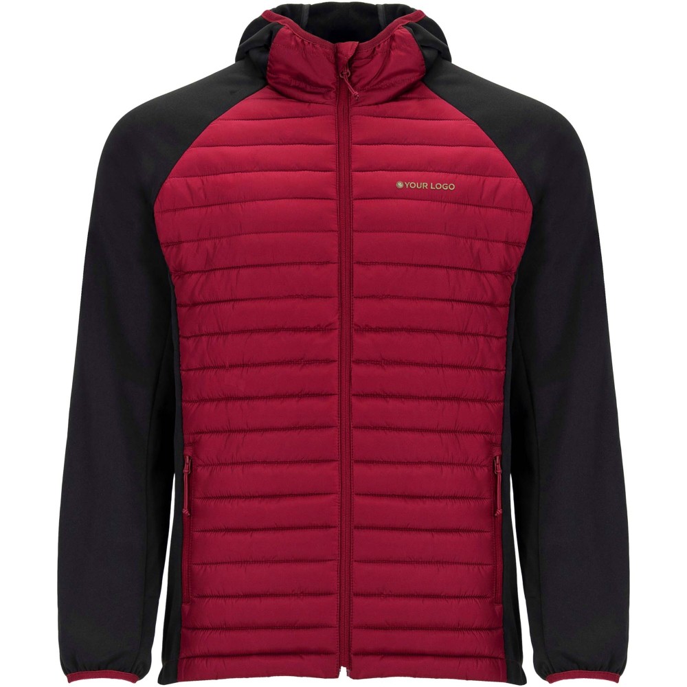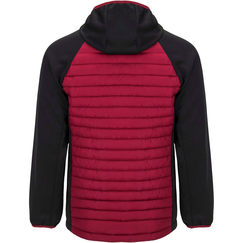 Uniszex dzseki két anyag kombinációja. Fix kapucni. Raglán ujjak. Softshell anyagból készült ujjak, oldalsó panelek és kapucni. Steppelt, pehelytapintású szövet elöl és hátul. Fordított cipzár, színben illeszkedő állvédő és cipzár. Két cipzáras elülső zseb. Gumis szegély a galléron, a kézelőn és a aljon. Szélálló modell. 100% poliészterből szőtt, kontrasztos anyag, interlock kötés 100% poliészterből. Töltet: műpehely, 100% poliészterből.