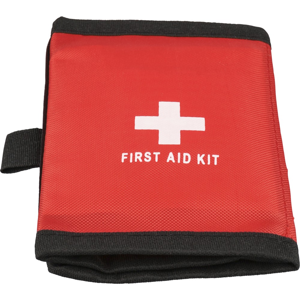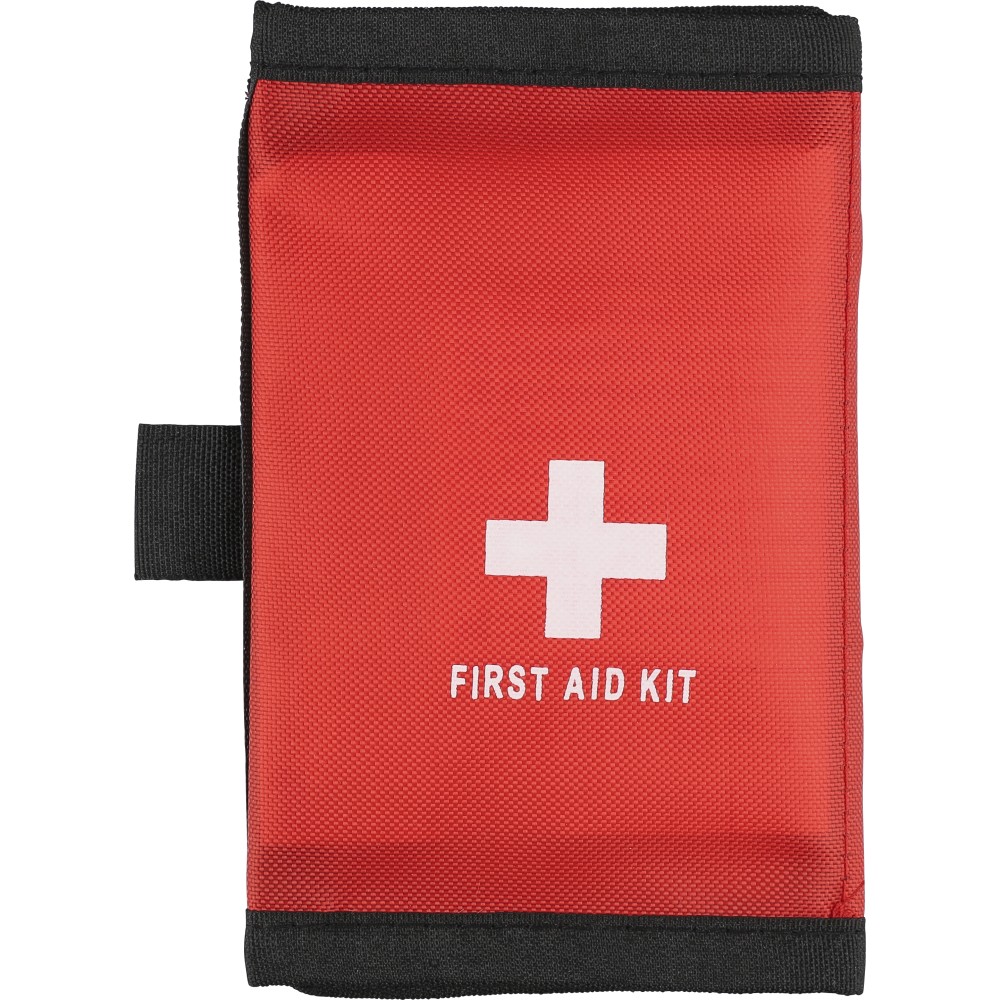 RPET 600D poliészterből készült elsősegélytasak tépőzárral és hordozópánttal. Tartalma: 5 sebtapasz, 1 steril fedőkötés, 1 nemszőtt törlőkendő, 8 alkoholos törlőkendő és 2 tisztítókendő. A külső felületen rPET címke található.