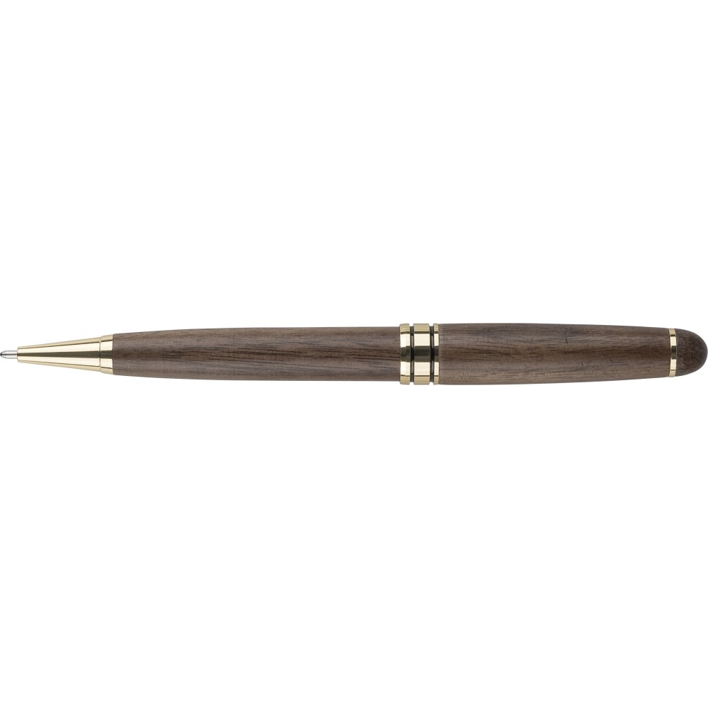 Diófából és rézből készült csavarós golyóstoll fém tollheggyel, klippel és díszítéssel, kék színű, német Dokumental tollbetéttel, megközelítőleg 1000 méter íráshosszúsággal. Juharfából készült dobozba és kartondobozba van csomagolva.
