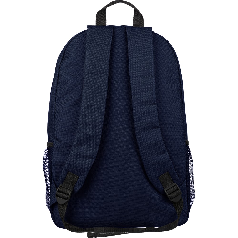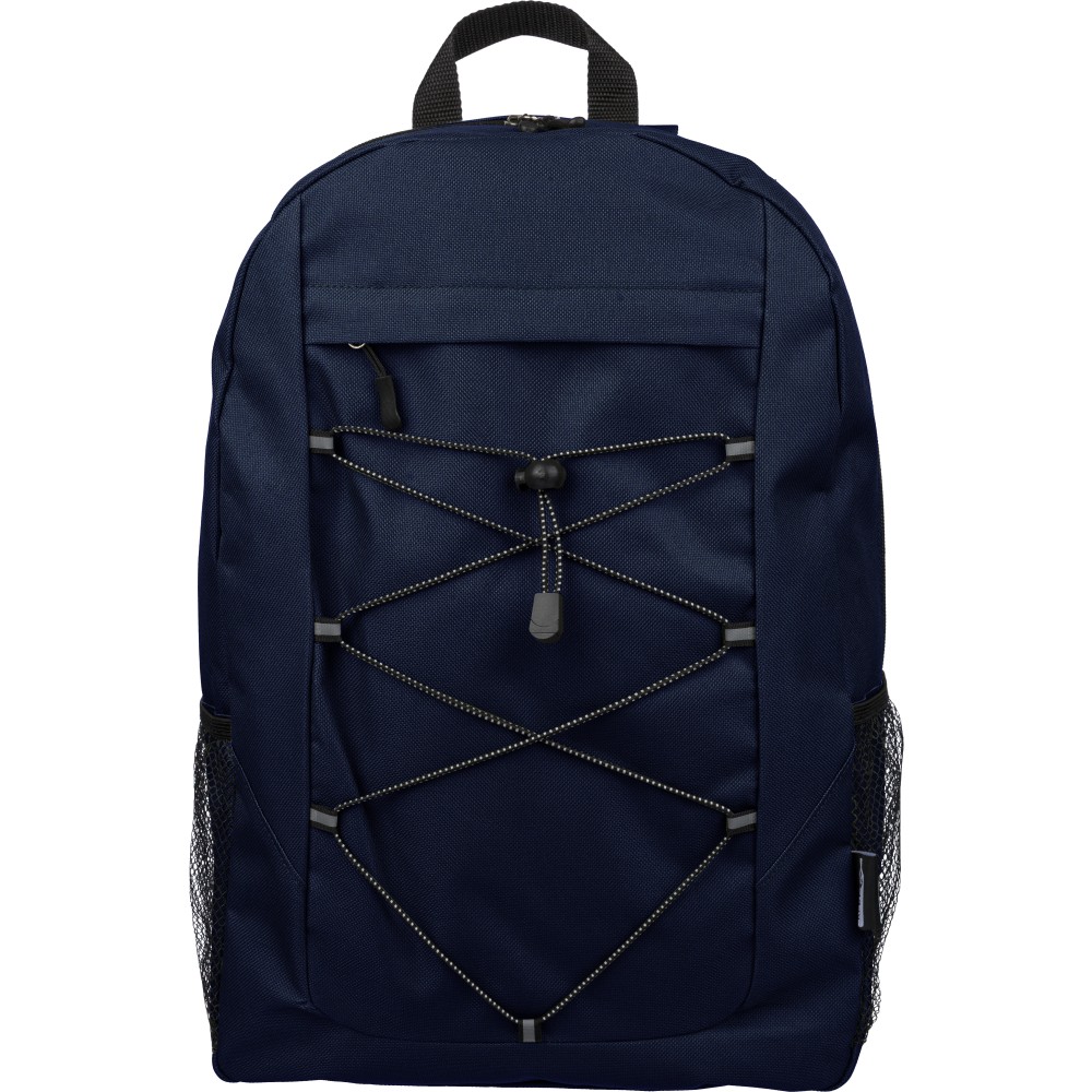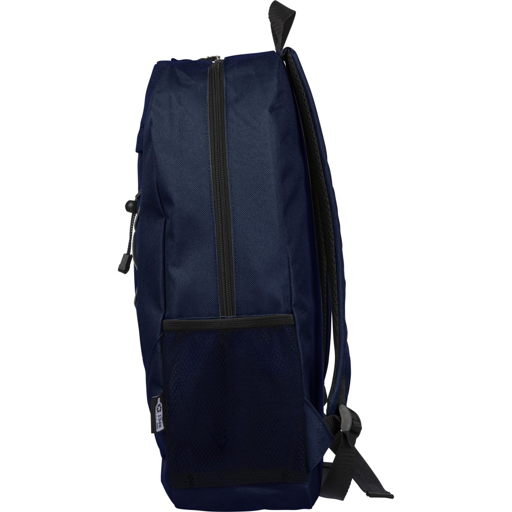 RPET poliészter 600D anyagból készült hátizsák húzózsinóros záródással és nagy cipzáras fő rekesszel. Hálós oldalzsebekkel, rugalmas elülső pántokkal, dekorációhoz kialakított kis elülső cipzáras zsebbel és állítható vállpántokkal rendelkezik. A terméken rPET alapanyagra utaló címke található.