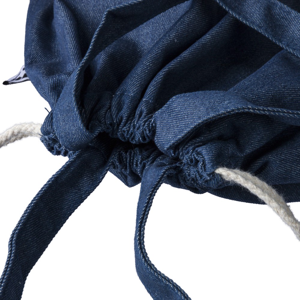 Újrahasznosított farmeranyagból készült húzózsinóros táska 40 × 38 cm méretben, 2,5 × 50 cm hosszúságú fülekkel és húzózsinóros záródással. A külső felületen újrahasznosított alapanyagra utaló címke található, vállpántként vagy kézi hurokként is hordható.