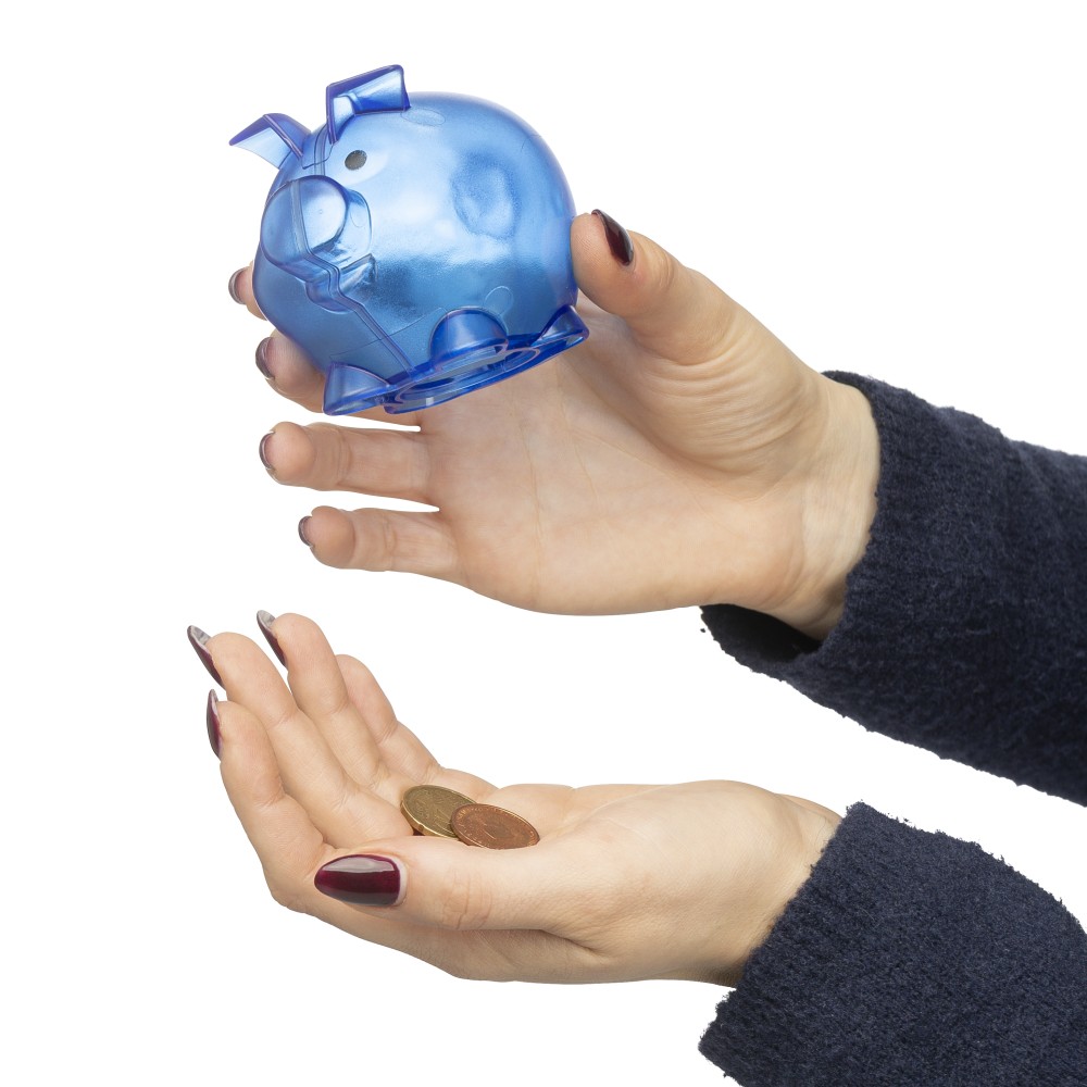 Újrahasznosított PS műanyagból készült, malacpersely. A hátoldalon recycled (újrahasznosított) alapanyagra utaló logó található.