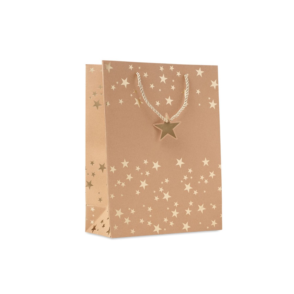 Elegáns kraftpapír ajándéktasak ünnepi mintával. Ajándékkísérő címkével. 250 g vastag papír. Ez a stílusos és ünnepi motívummal díszített papírtasak tökéletes csomagolás egy különleges személynek szánt, átgondolt ajándék számára. Egy tetszetősen becsomagolt ajándékot átadni már fél siker! FSC® -certified | FSC RECYCLED, P5.3, FSC-C213206