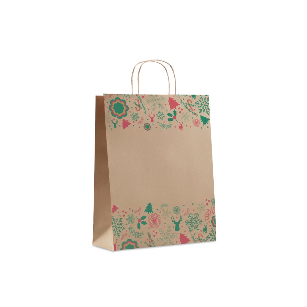Nagy papír karácsonyi ajándéktasak. 90 g vastag, 50%-ban újrahasznosított papír. EU-ban gyártva. Egy tetszetősen becsomagolt ajándékot átadni már fél siker! Használja ezt a karácsonyi papír ajándéktasakot, hogy megadja a végső simítást ajándékának. FSC® -certified | FSC MIX, P5.3, FSC-C213206