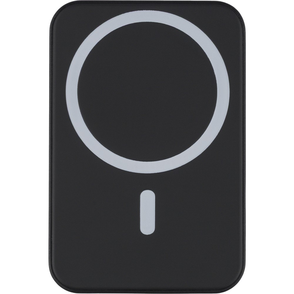 Újrahasznosított ABS anyagból készült vezeték nélküli töltős powerbank 5 000 mAh kapacitással és 15 W MagSafe kompatibilis vezeték nélküli töltéssel. Type-C in/out csatlakozással, beépített biztonsági védelmekkel és automatikus kikapcsolási funkcióval. Nem MagSafe készülékekhez fémgyűrűt tartalmaz. Az oldalán gravírozott recycled (újrahasznosított) alapanyagra utaló logó található. Selyempapírral bélelt barna dobozba csomagolva.
