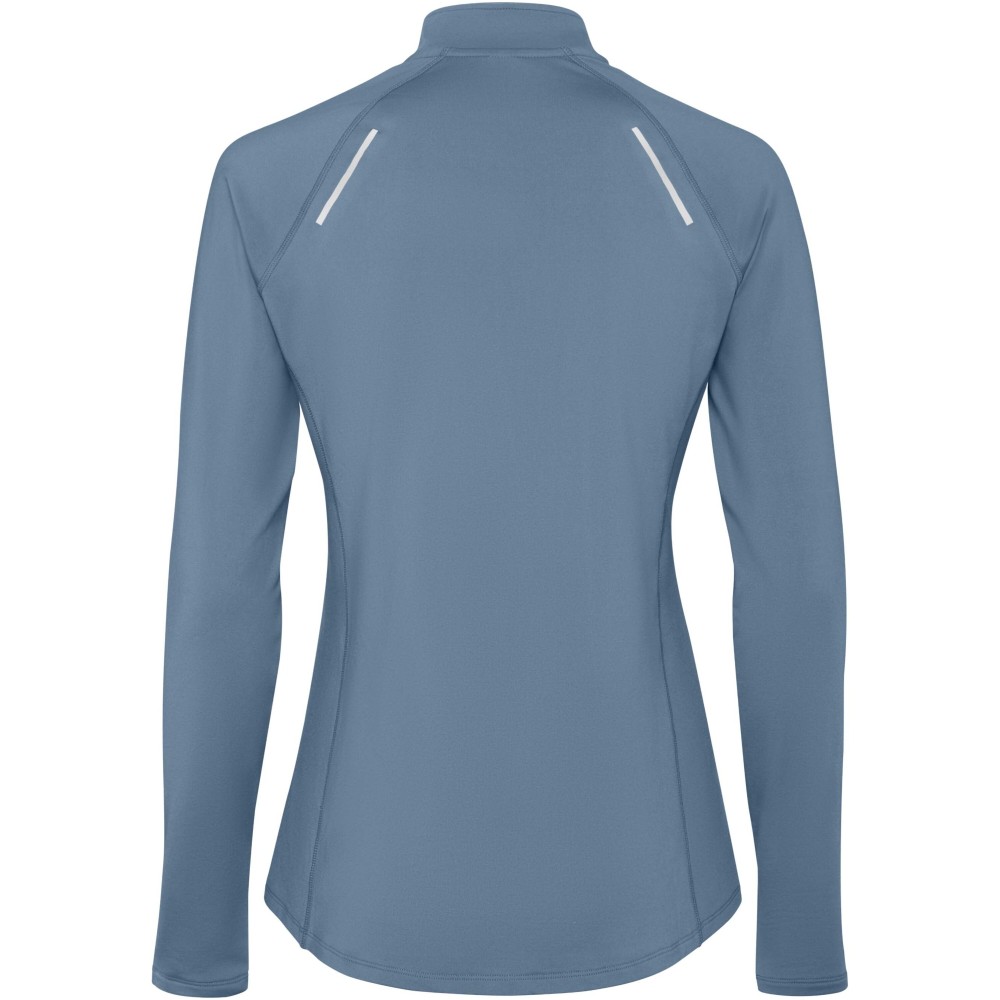 Női hosszúujjú technikai raglán pulóver. Gallér fordított félcipzárral, fényvisszaverő részletekkel. Erősített varrások. Kézelő hüvelykujj nyílással. Fényvisszaverő részletek a háton. A hátul enyhén hosszított fazon. Meleg, bolyhos belső anyag.