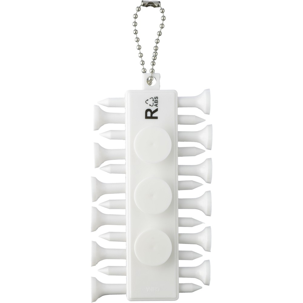 Újrahasznosított ABS goltee-készlet, amely 12 tee-ből áll, kompakt tartóban, hátulján három jelölővel. Fémzsinórral a könnyű rögzítés érdekében, hátulján pedig újrahasznosított ABS logóval.