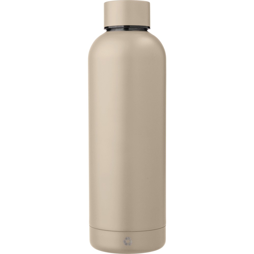 Újrahasznosított rozsdamentes acél (s/s304) duplafalú palack, matt felülettel. Barna kartondobozba egyedileg csomagolva. Űrtartalom: 500 ml.